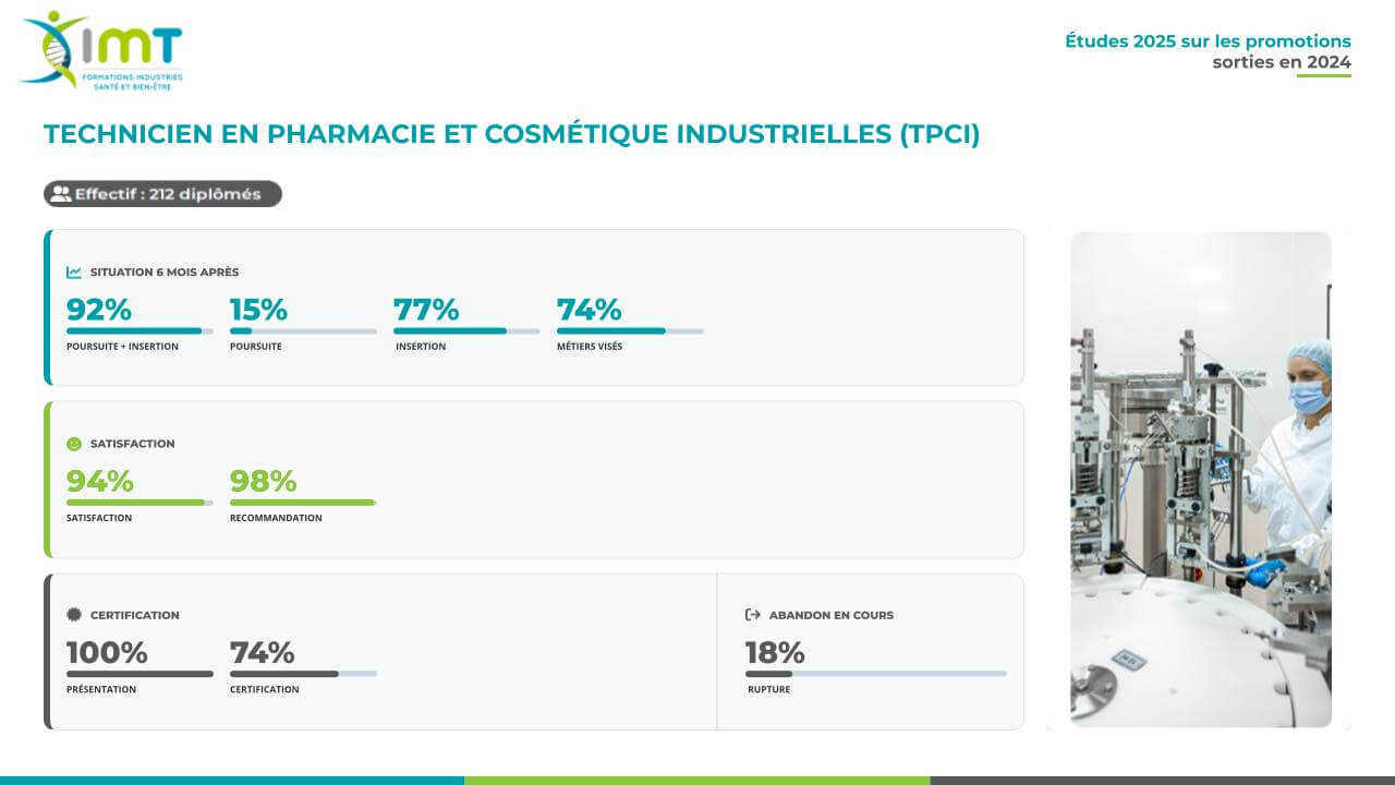 Certification professionnelle de niveau 4. Organisme certificateur : Groupe IMT. Suivre la formation de TPCI permet d’occuper des postes en production de médicaments et de produits cosmétiques.