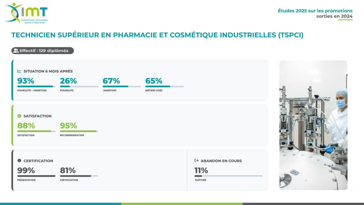 Certification professionnelle de niveau 5. Organisme certificateur : Groupe IMT. Suivre la formation de TSPCI permet d’occuper des postes en production de médicaments et de produits cosmétiques ainsi que des fonctions supports : en assurance qualité, développement galénique, qualification/validation et amélioration continue.